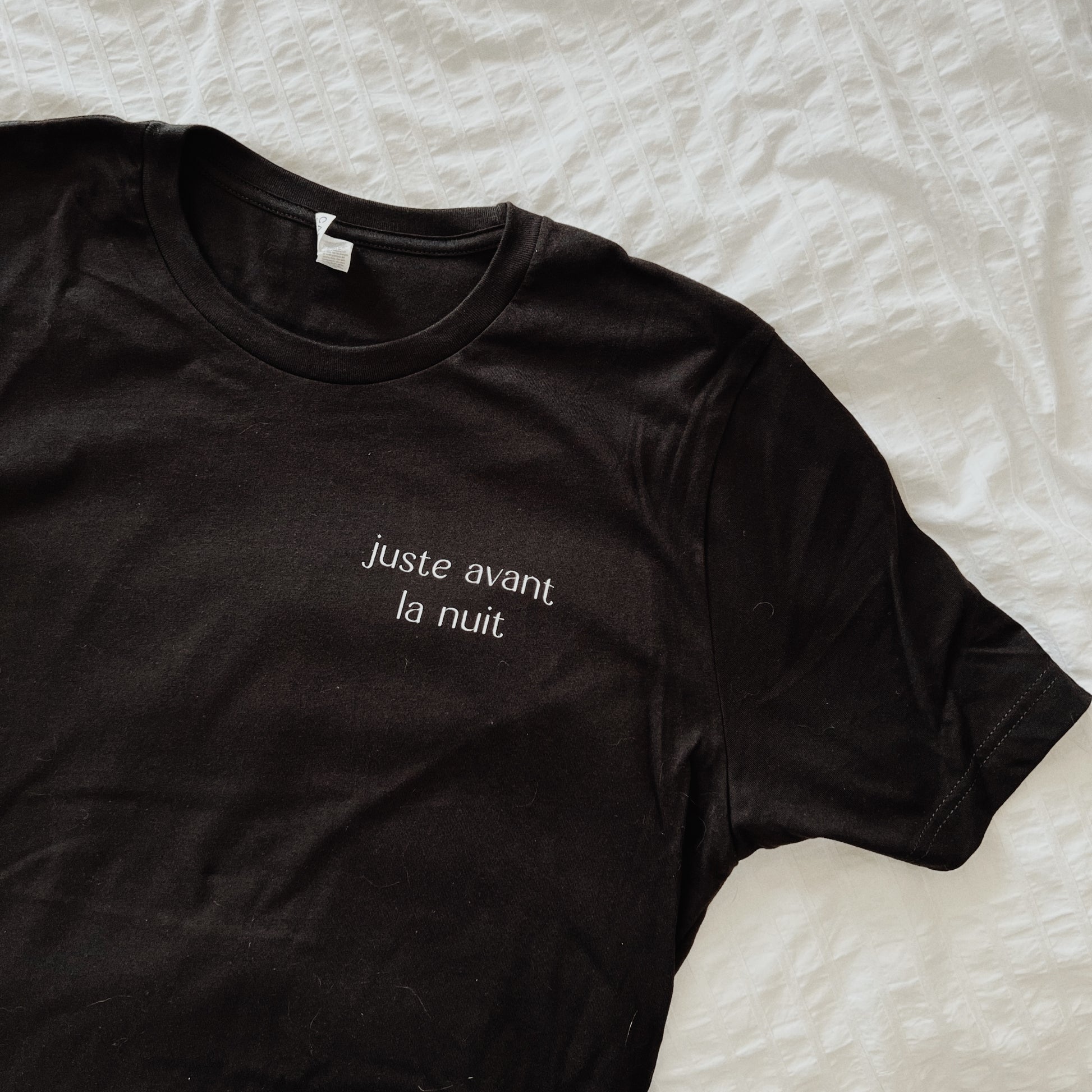 Fait à 100% en coton. Les grandeurs sont unisexes. À l'avant, on retrouve le titre de l'album Juste avant la nuit, imprimé sur le côté coeur. À l'arrière, on retrouve une illustration conçue en collaboration par Véronique ainsi que l'artiste visuelle Valfelto.